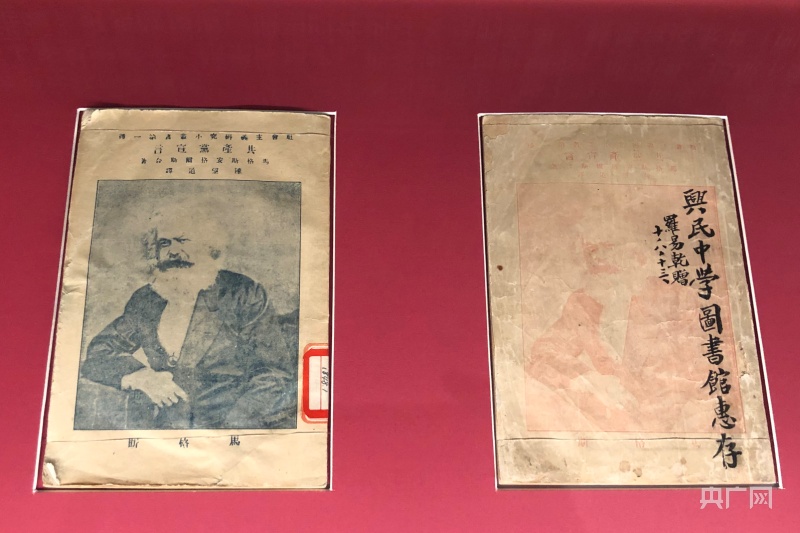 1920年9月出版的陳望道譯《共產黨宣言》(一級文物)(左)(央廣網記者 王晶 攝)