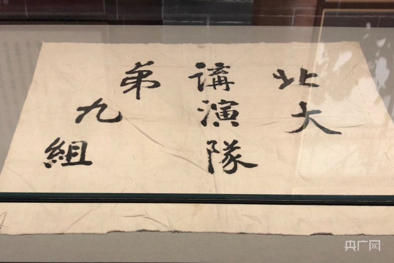 1919年6月,北京大學講演隊第九組在街頭演講用的布旗(一級文物)(央廣網記者 王晶 攝)