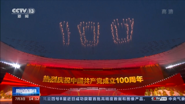 演出高潮部分,高達16米的金色黨徽莊嚴升起,光芒四射。歌聲、掌聲簇擁出10面巨型紅旗,迎風招展。此時,焰火再次燃放,兩個100秒燃放表演時長,致敬“兩個一百年”奮斗目標。演出結束時,在場全體人員合唱《沒有共產黨就沒有新中國》,聲浪沖天、全場沸騰。