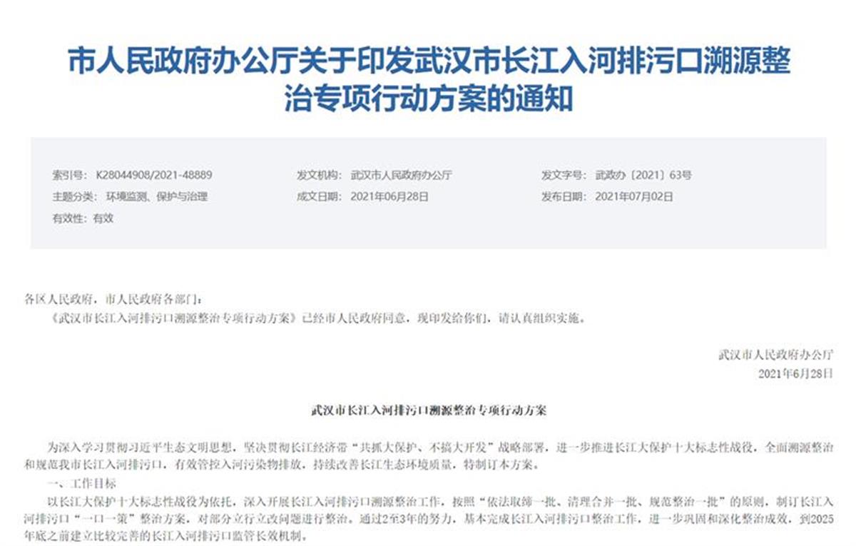 武漢市長江入河排污口溯源整治專項行動方案近日出爐。武漢將對1842個長江武漢段入河排污口進(jìn)行溯源,并設(shè)置排污口標(biāo)志牌,通過2至3年的努力,基本完成長江入河排污口整治工作,到2025年底之前建立比較完善的長江入河排污口監(jiān)管長效機(jī)制。