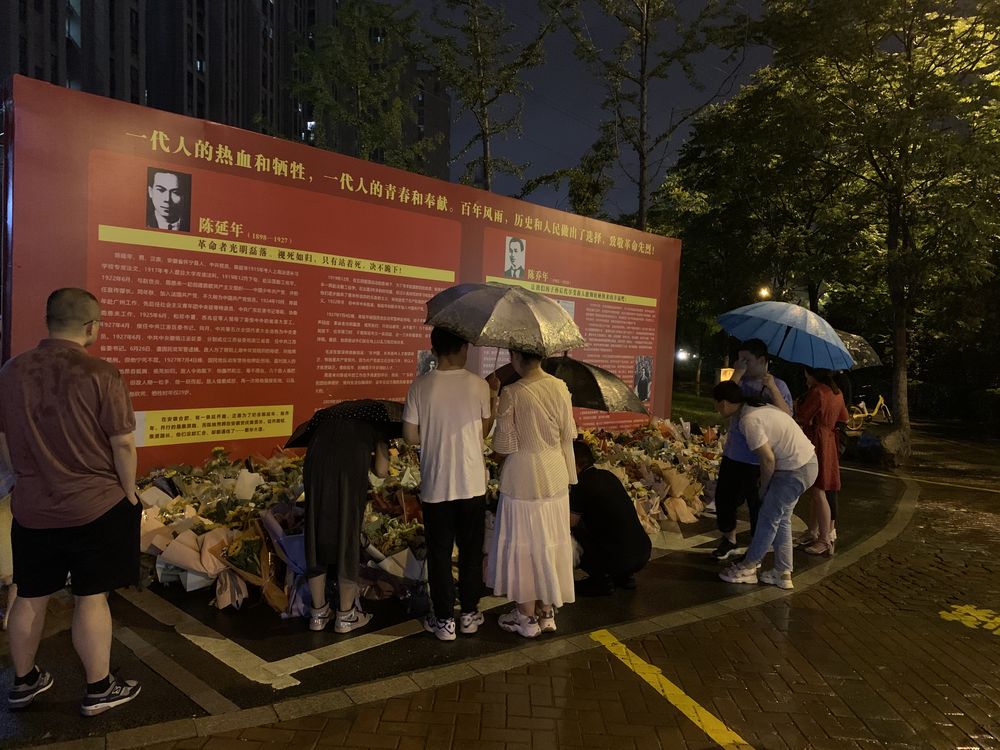 2021年7月2日晚,合肥延喬路,人們在雨中為革命先烈獻花。新華社發