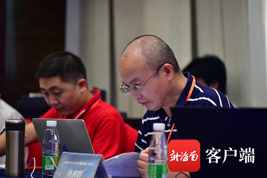 2021年海南自貿港創業大賽(復賽)現場。評委們在仔細打分。記者 陳衛東攝