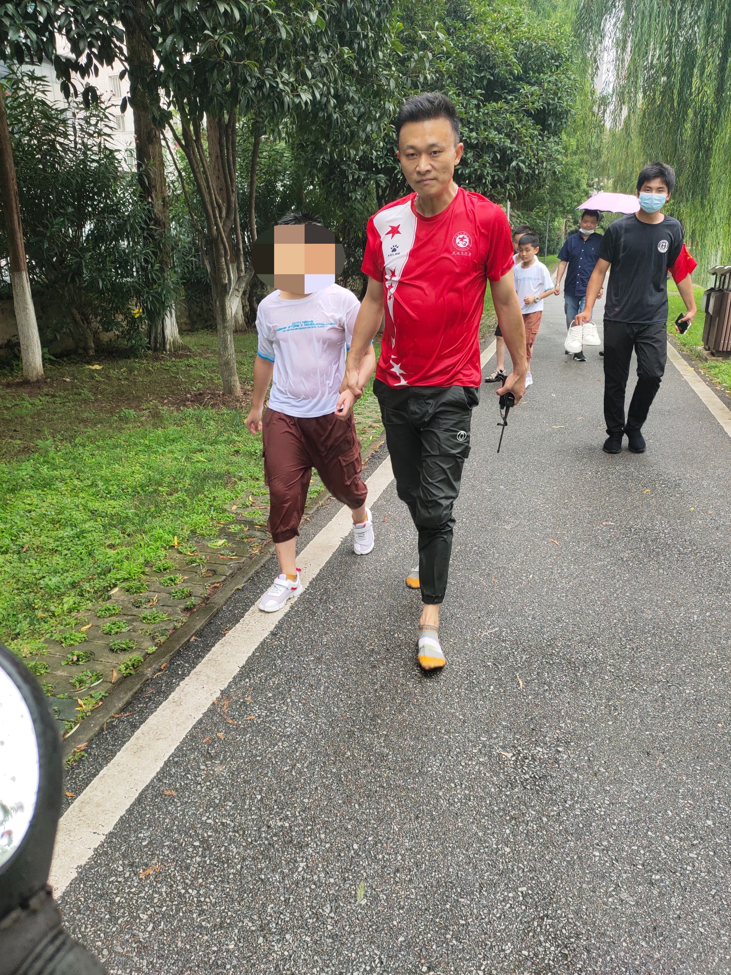 上岸后,董俊峰顧不上穿鞋,第一時間護送男孩到辦公室。由于小男孩記不住父母聯系方式,公園管理中心工作人員便先開車帶其弟弟回家尋找父母。