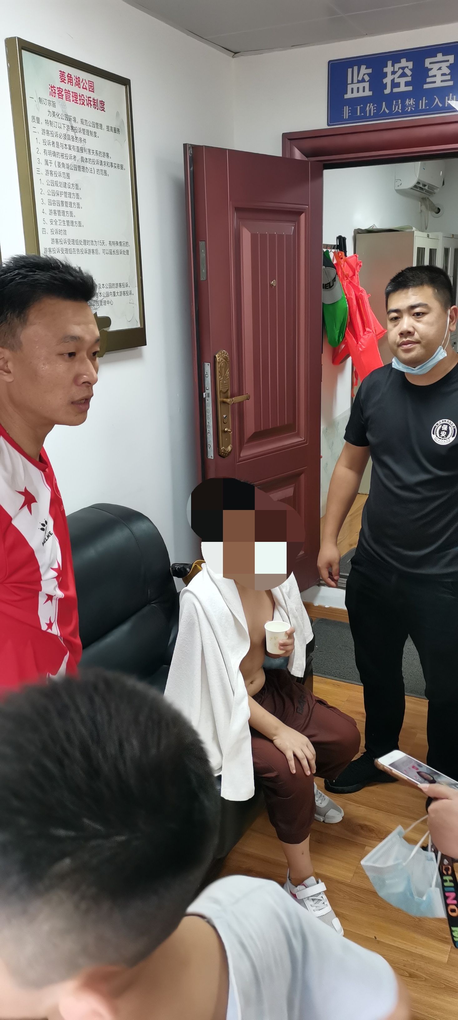 董俊峰則與同事拿來浴巾幫男孩擦干,還找來一條安保隊員的干凈短褲為男孩換上,并為他倒上熱水。據小男孩說,他是一名4年級小學生,當天與弟弟和同學結伴到公園玩耍,事發時自己正騎著一輛山地車,一不小心連車帶人沖進了湖里。