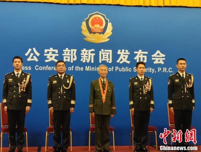 “七一勛章”獲得者崔道植(中)出席公安部新聞發布會。公安部供圖