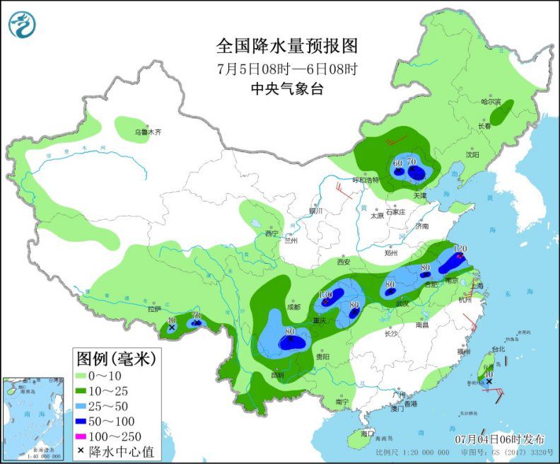 預計,7月4日08時至5日08時,安徽中南部、江蘇中南部、浙江北部、湖北東部、四川東南部、重慶西南部、貴州北部、廣西北部、內蒙古東北部、黑龍江西部、西藏東南部等地的部分地區有大到暴雨,其中,江蘇中部、安徽中部局地有大暴雨(100~150毫米)。上述部分地區伴有短時強降水(最大小時降雨量20~40毫米,局地可超過50毫米),局地有雷暴大風或冰雹等強對流天氣。中央氣象臺7月4日06時繼續發布暴雨藍色預警。