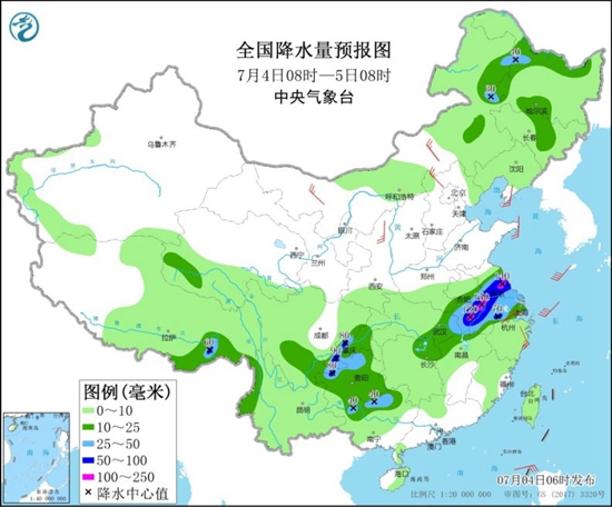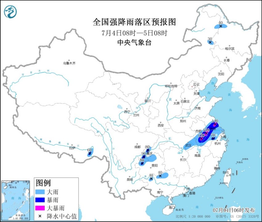 預計,7月4日08時至5日08時,安徽中南部、江蘇中南部、浙江北部、湖北東部、四川東南部、重慶西南部、貴州北部、廣西北部、內蒙古東北部、黑龍江西部、西藏東南部等地的部分地區有大到暴雨,其中,江蘇中部、安徽中部局地有大暴雨(100~150毫米)。上述部分地區伴有短時強降水(最大小時降雨量20~40毫米,局地可超過50毫米),局地有雷暴大風或冰雹等強對流天氣。