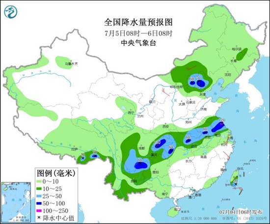 中央氣象臺7月4日06時繼續發布暴雨藍色預警: