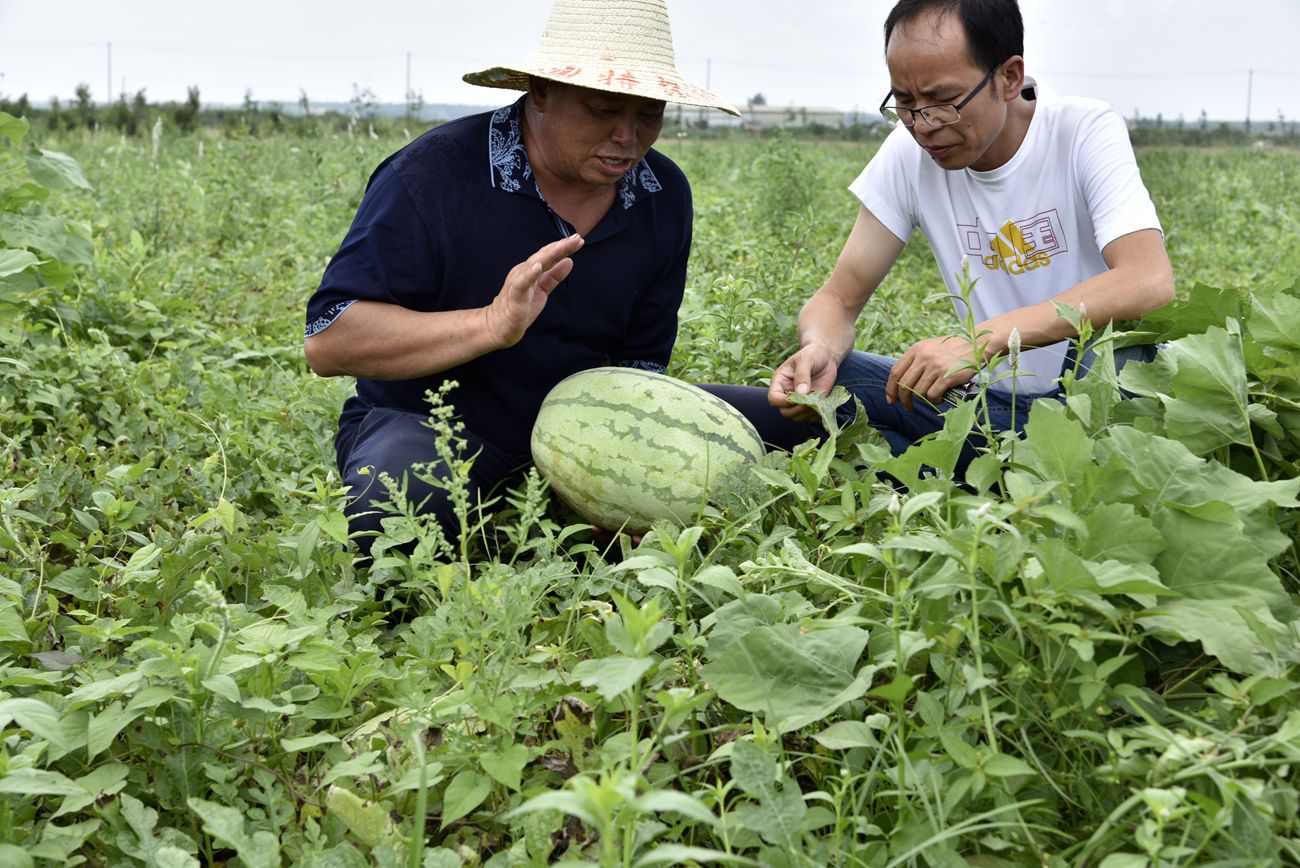 七壕村村民正在田里查看有機西瓜的長勢。記者戴紅兵 攝