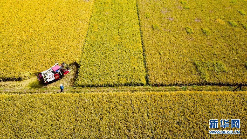 2020年10月21日,在山東省棗莊市臺兒莊區邳莊鎮,收割機在收獲水稻(無人機照片)。新華社記者 郭緒雷 攝