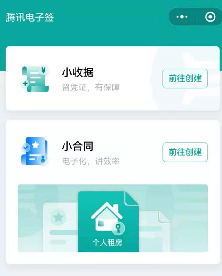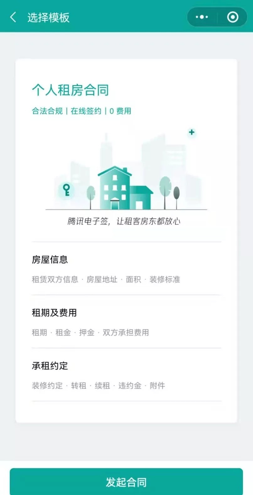 目前騰訊電子簽推出兩大功能:”小收據“、“小合同”。小合同提供租房合同模版,租住雙方在“騰訊電子簽”微信小程序中即可簽署具備法律效力的租房合同。