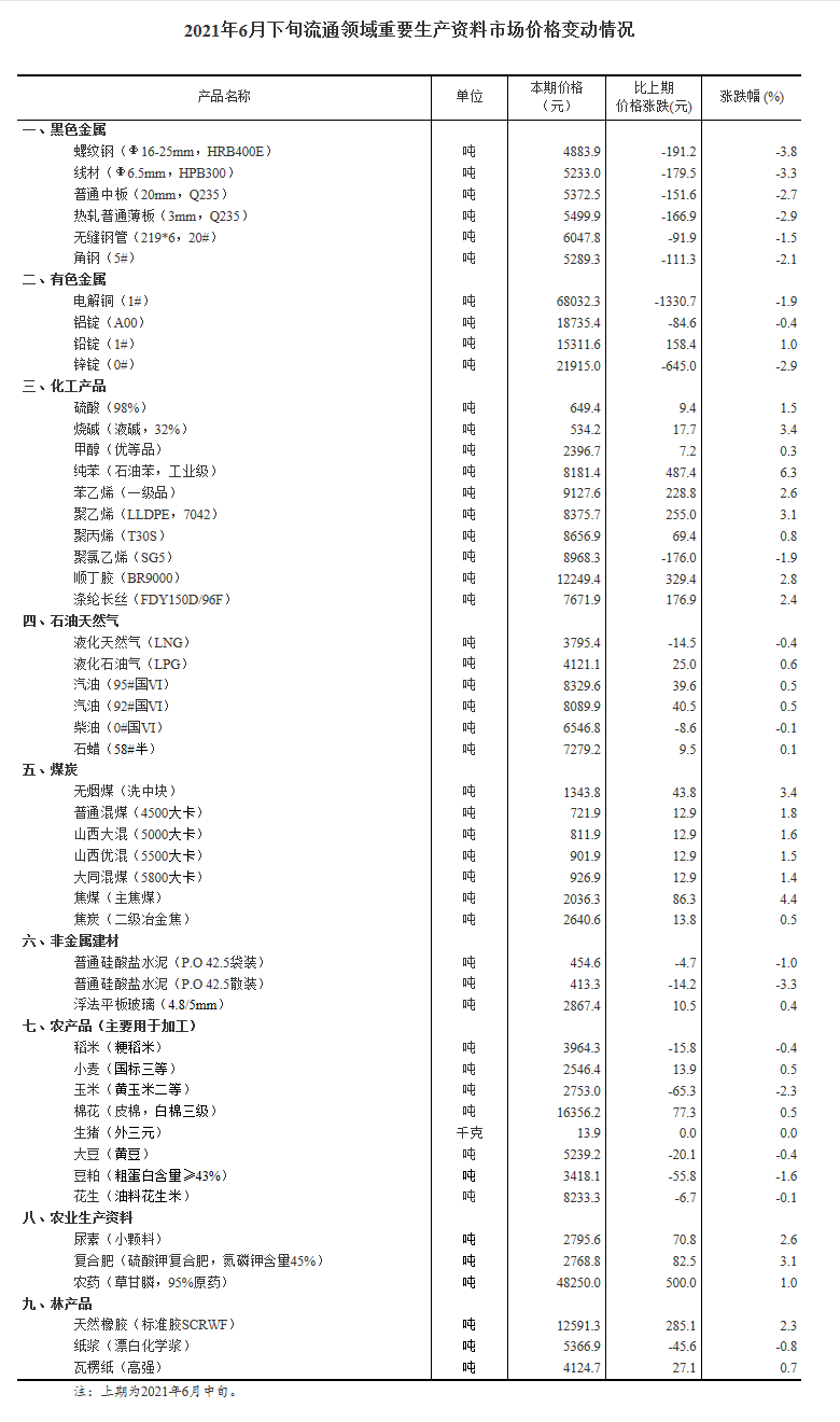 人民網(wǎng)北京7月5日電 (申佳平)據(jù)國家統(tǒng)計局官網(wǎng)消息,據(jù)對全國流通領域9大類50種重要生產(chǎn)資料市場價格的監(jiān)測顯示,2021年6月下旬與6月中旬相比,29種產(chǎn)品價格上漲,20種下降,1種持平。