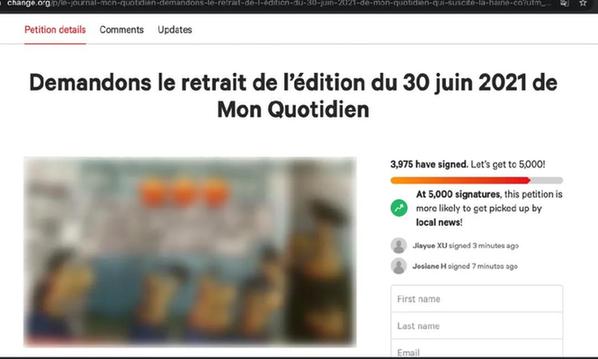 《我的日報》6月30日在頭版刊登題為“中國人正在竊取我們的自由”的報道抹黑新疆后,法國網(wǎng)友7月2日在請愿網(wǎng)站發(fā)起倡議,要求《我的日報》撤銷上述報道。