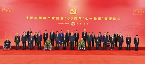 2021年6月29日,慶祝中國共產(chǎn)黨成立100周年“七一勛章”頒授儀式在北京人民大會(huì)堂金色大廳隆重舉行。習(xí)近平等領(lǐng)導(dǎo)同志同“七一勛章”獲得者合影。 新華社記者 謝環(huán)馳/攝