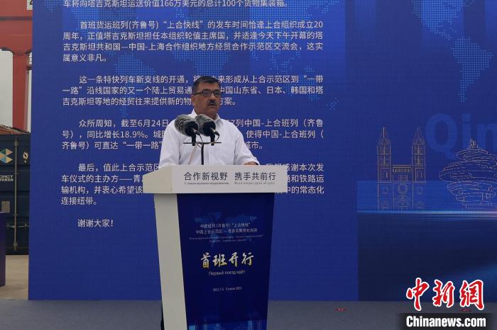 中新網(wǎng)青島7月5日電 (記者 胡耀杰)中國—上海合作組織地方經(jīng)貿(mào)合作示范區(qū)(簡稱“上合示范區(qū)”)前往塔吉克斯坦首都杜尚別的中歐班列(齊魯號)“上合快線”5日發(fā)出,從上合示范區(qū)青島多式聯(lián)運中心中鐵集裝箱青島中心站啟程。這是首班由上合示范區(qū)發(fā)往塔吉克斯坦首都杜尚別的中歐班列(齊魯號)“上合快線”。