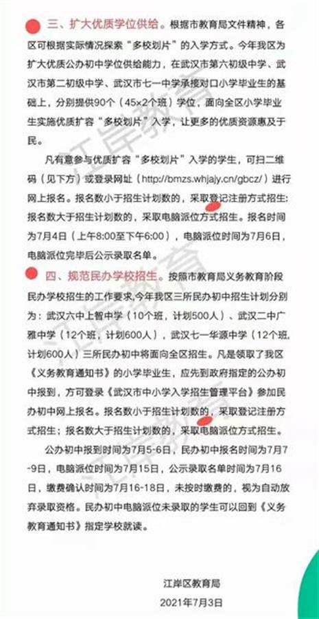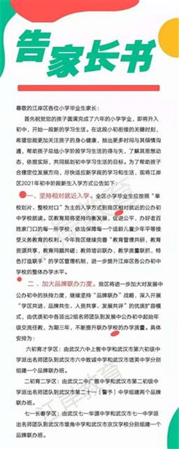 該通知指出,今年江岸區為擴大優質公辦初中學位供給能力,在武漢市第六初級中學、武漢市第二初級中學、武漢市七一中學承接對口小學畢業生的基礎上,分別提供90個(45x2個班)學位,面向全區小學畢業生實施優質擴容“多校劃片”入學,讓更多的優質資源惠及于民。