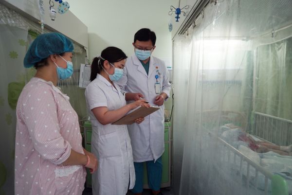 俊俊出院前夕,武漢兒童醫院血液腫瘤科主任醫師熊昊(右一)和許秀文醫生(中)查看患兒恢復情況。通訊員郭林攝