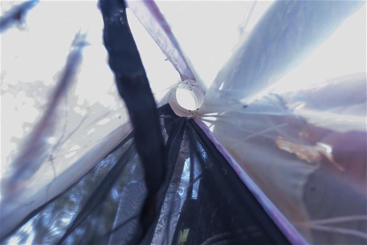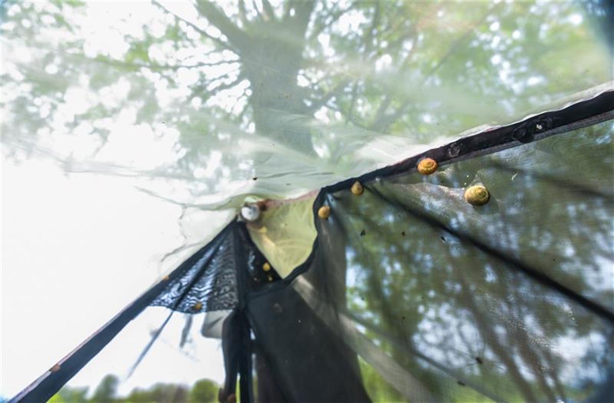 在天興洲,樹林中架設特殊帳篷,掛好收集瓶