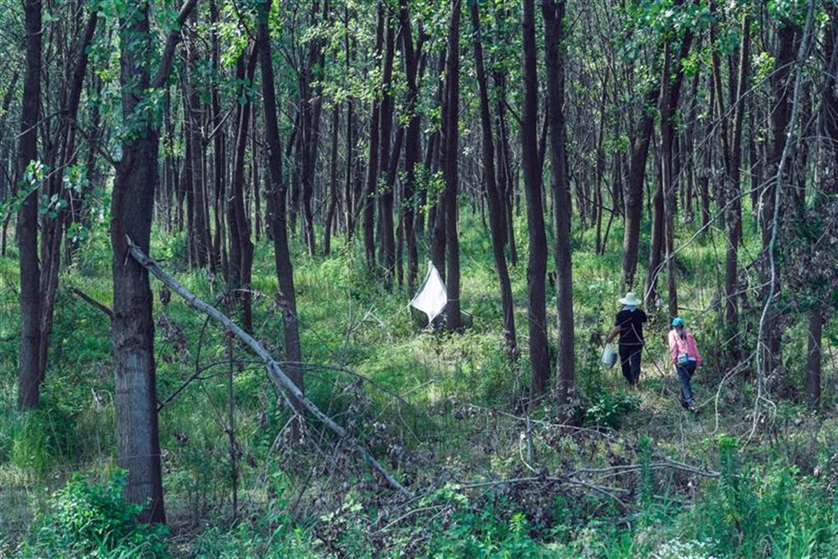 在天興洲,樹林中架設特殊帳篷,吸引蟲子入帳、進入收集瓶