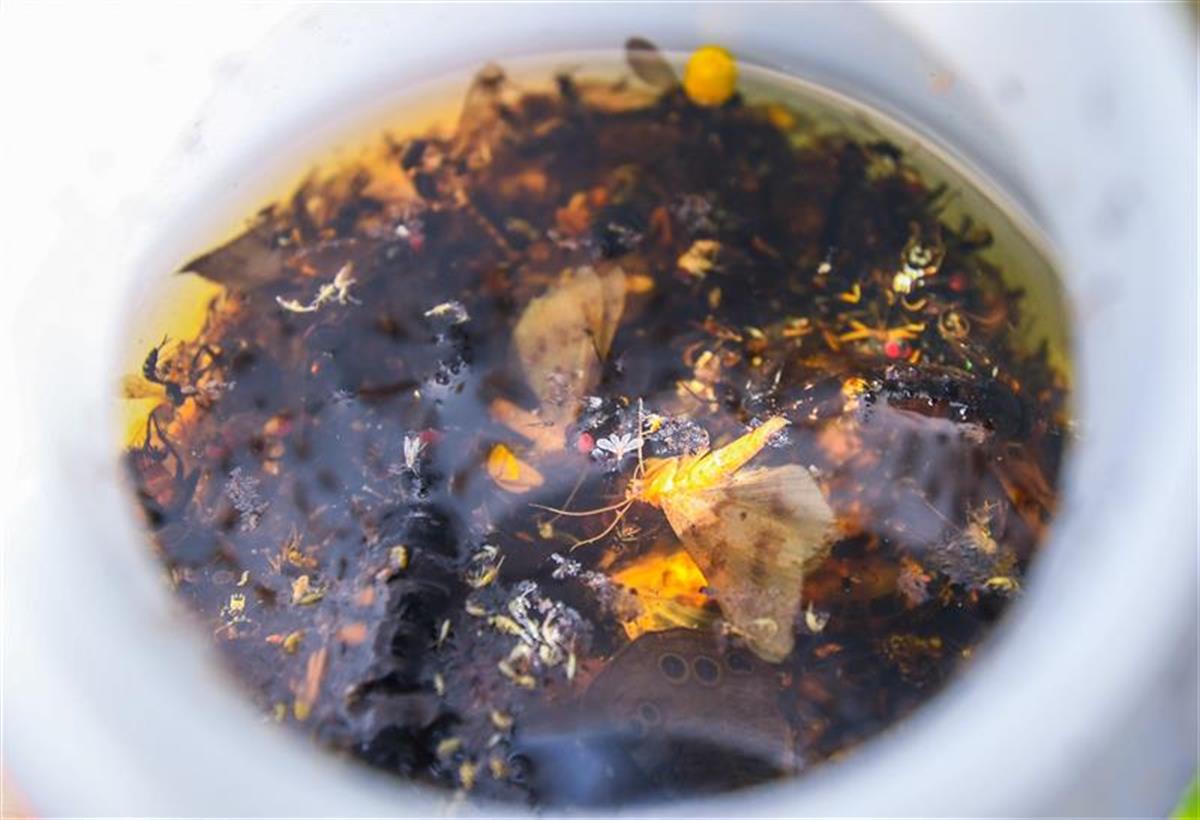 別小瞧這簡易一搭,收獲豐盛。從5月25日扎營在此,一個多月時間,已是滿滿一瓶昆蟲浸在酒精里。