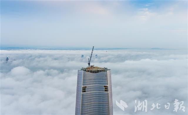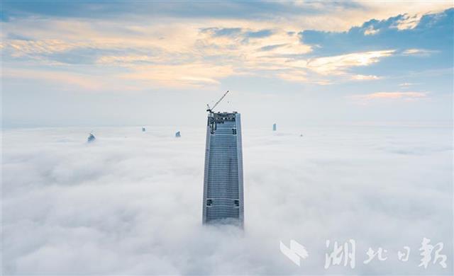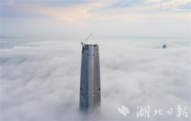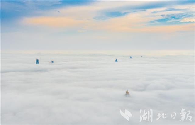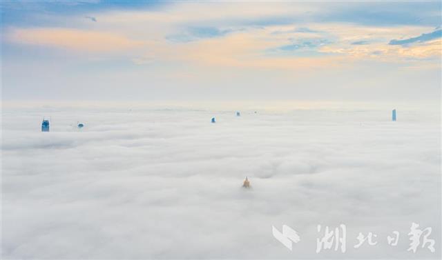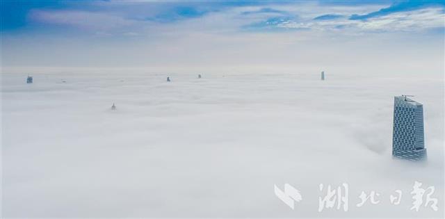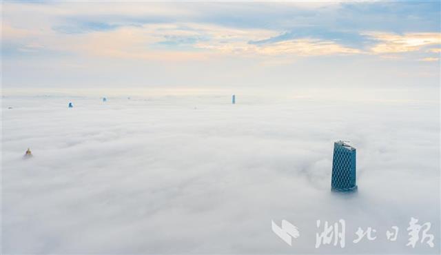 7月5日傍晚,暴雨過后,武漢城區被低矮的云層覆蓋,從高空俯瞰,高層樓宇直插云海,宛如仙境。(湖北日報全媒記者 柯皓 攝)