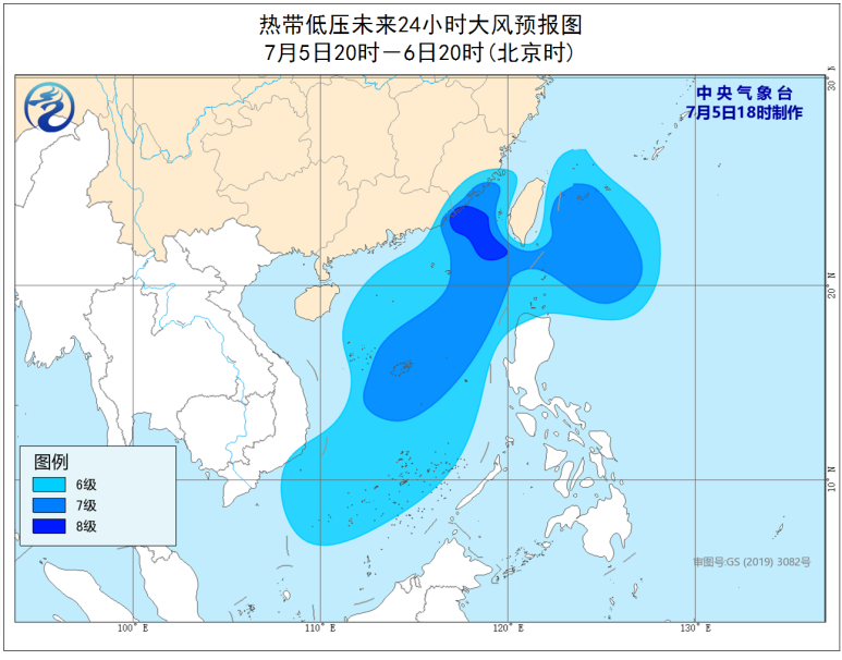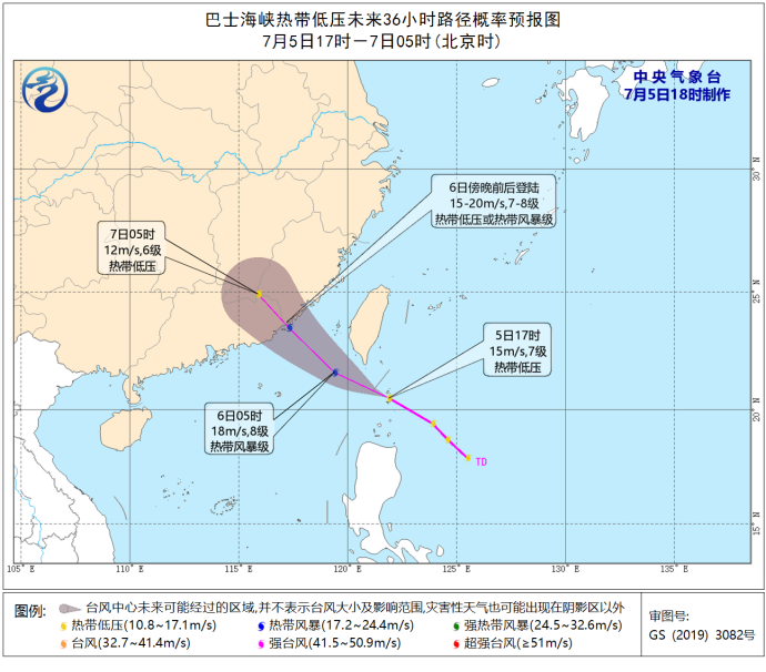 中央氣象臺今天18時發布臺風藍色預警:菲律賓呂宋島以東洋面熱帶低壓已于今天(7月5日)下午5時移至巴士海峽海面,其中心位于我國臺灣島鵝鑾鼻東南方大約190公里的海面上,中心附近最大風力有7級。預計該低壓中心將向西北方向移動,有可能于未來12小時發展為臺風,并將于6日傍晚前后在廣東汕尾到福建漳浦一帶沿海登陸(熱帶低壓或熱帶風暴級,7—8級,15—20米/秒)。