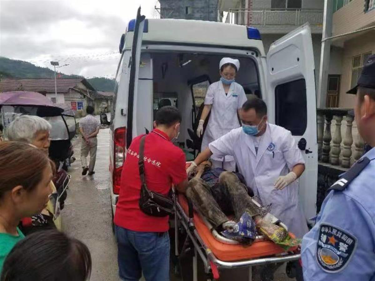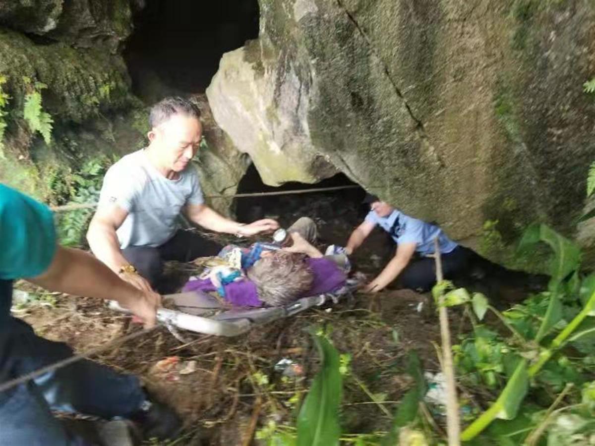 當?shù)卮迕癜l(fā)現(xiàn)后立即報警,民警趕到后打著電筒搜尋,發(fā)現(xiàn)受傷倒地的老婆婆。洞內(nèi)狹窄無法抬出,當?shù)匦l(wèi)生院醫(yī)護人員又帶著擔架趕來,將擔架慢慢放到洞內(nèi),把老人固定在上面,民警在下面匍匐泥地扶著擔架,上面村民用力拉繩子。民警手腳劃破,渾身泥污,半個小時后終于把老人抬出洞口。