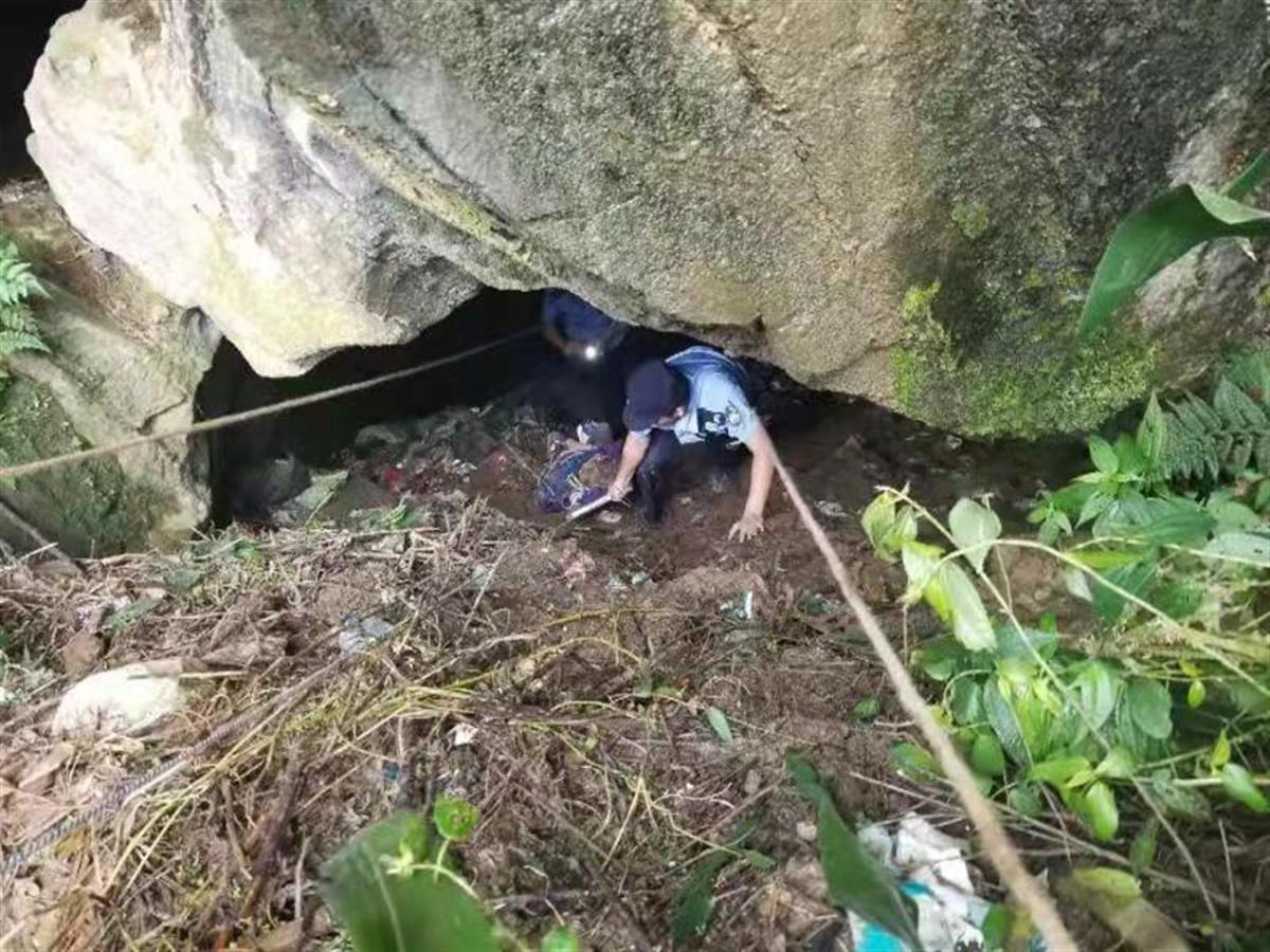 李強來到天坑邊緣大聲呼喊,從天坑里傳出黃婆婆微弱的回應,用電筒反復搜尋,終于在洞內(nèi)左側一角落位置看到了黃婆婆的身影。李強和同事劉恩將救援繩綁在身上,因前一天下雨的緣故,洞內(nèi)特別濕滑,李強、劉恩在周圍村民的幫助下,從洞口下滑至洞內(nèi)。