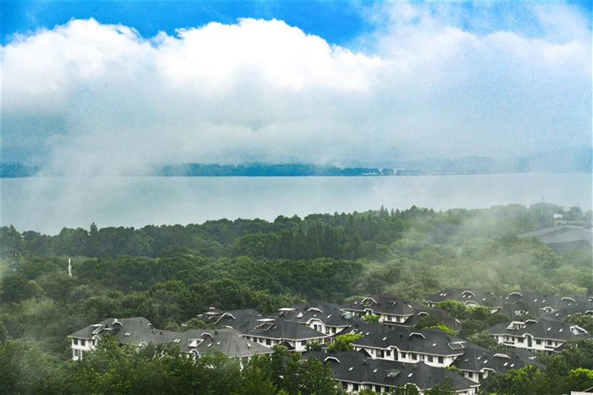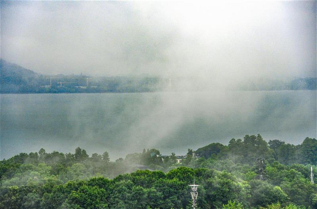 7月5日17時50分,大雨過后,東湖上一陣煙雨悠然飄過,猶如仙境。