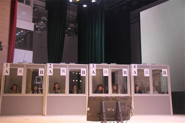 在初賽環節,學院使用了自主設計的“同傳接力大賽考試系統”,邀請8個語對的選手在規定時間內登陸系統完成“外譯中”和“中譯外”兩輪同傳測試。決賽當天的線下比賽分7輪進行。選手通過抽簽的形式決定自己的輪次、箱號和傳譯順序。每一輪中,每位選手共有三次口譯展示環節,選手需要將演講視頻從對應語言翻譯成漢語,還需要自行選擇頻道,與其他兩個語種的口譯員完成接力,將其中文翻譯為各自目標語言。這是口譯素質的考驗,也是心態和體力的挑戰。