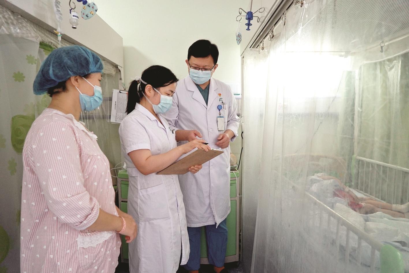 俊俊出院前,武漢兒童醫院血液腫瘤科熊昊(右一)查看恢復情況
