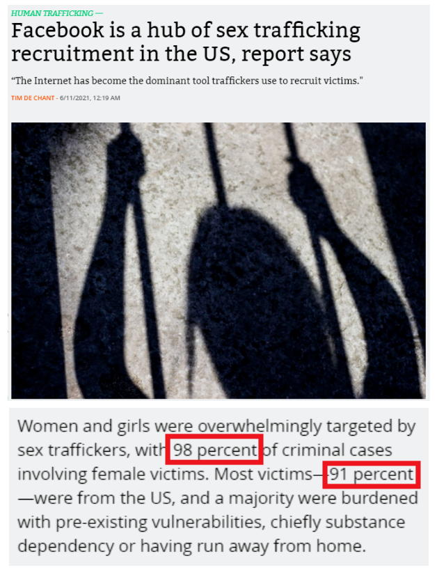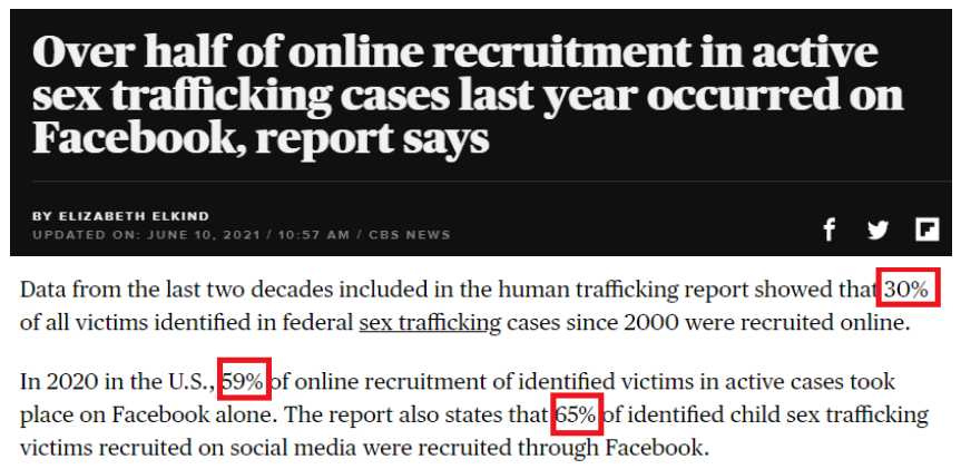 美國人口販運研究所上月發布的《2020年聯邦人口販運報告》顯示,2000年至2020年美國有案可查的性販運案件中,有30%的受害者是在互聯網上被誘騙的,而在臉書上被騙的受害者占了其中大多數,去年的這一比例高達59%;兒童性販運受害者中更是有多達65%的人是在臉書上被騙的。