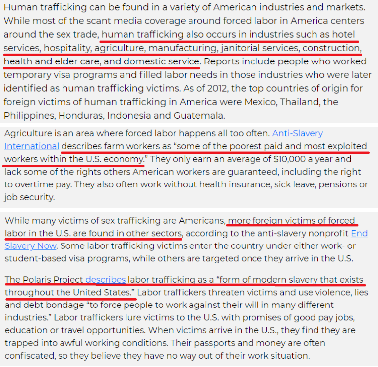致力于根除現代奴隸制的非營利組織“北極星項目”將勞工販運描述為“存在于整個美國的一種現代奴隸制形式”:人販子使用暴力、謊言和債務等手段,“迫使人們在許多不同行業從事違背自己意愿的工作”。