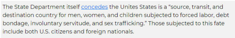 就連美國國務院自己也承認,美國是強迫勞動、債務奴役、非自愿奴役、性販運受害者的“來源國、中轉國和目的地國”,受害者中包括美國公民和外國公民。