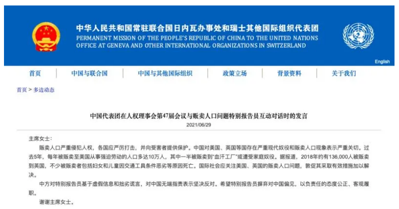 人們還記得,就在此前的聯合國人權理事會第47屆會議上,中國代表團與販賣人口問題特別報告員進行互動對話時,曾對美國等國存在的嚴重現代奴役和販賣人口現象表示了嚴重關切。