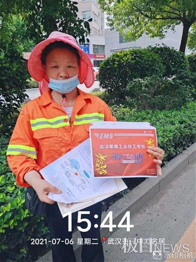 7月6日,武昌一名環衛工,在公交車站撿到一張中專入學通知書。通過錄取書上學校的電話號碼,她將錄取通知書交給了學生家長。