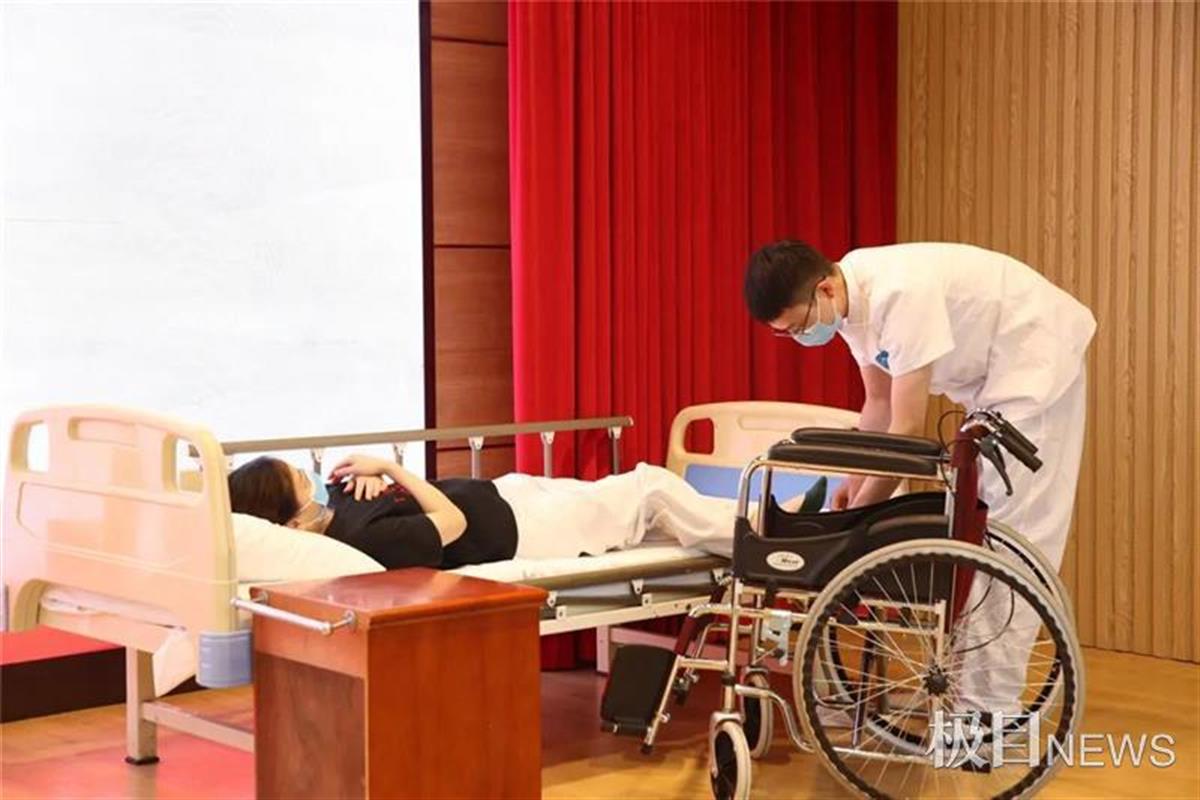 “來,我來扶您到輪椅,請慢一點(diǎn)。”童景小心地?cái)v扶起“老人”,將其慢慢挪到輪椅上,再推著“老人”出去散步……