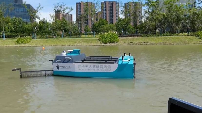 在張江人工智能島12棟-16棟樓之間的“智慧河”水域上,一艘外號“大白鯨”的無人駕駛水面清潔船正在辛勤勞作。它搭載了AI視覺識別、機器人等技術,全程通過無人駕駛船自動巡航,自主識別水面漂浮垃圾,對水域漂浮的垃圾進行及時清理。