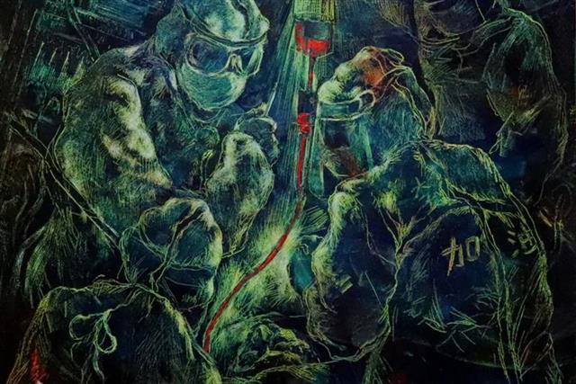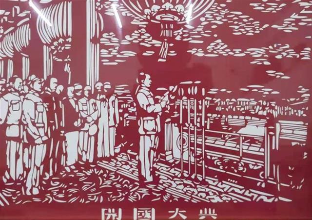 書畫展中還包含有描繪和反映重要歷史事件、愛國主義教育基地、抗擊新冠肺炎疫情等內容的繪畫與設計作品。程高瑞老師的油畫作品《凌晨五點》生動地描繪了新冠疫情防控期間,醫護人員身著防護服搶救患者的畫面,表現了共產黨員“舍己為人、救死扶傷”的崇高追求和精神境界。專業教師潘磊老師的設計作品《開國大典》,采用激光雕刻剪紙的形式把開國的宏大場景進行了再現,進一步激發我們對于祖國的熱愛和自豪之情!