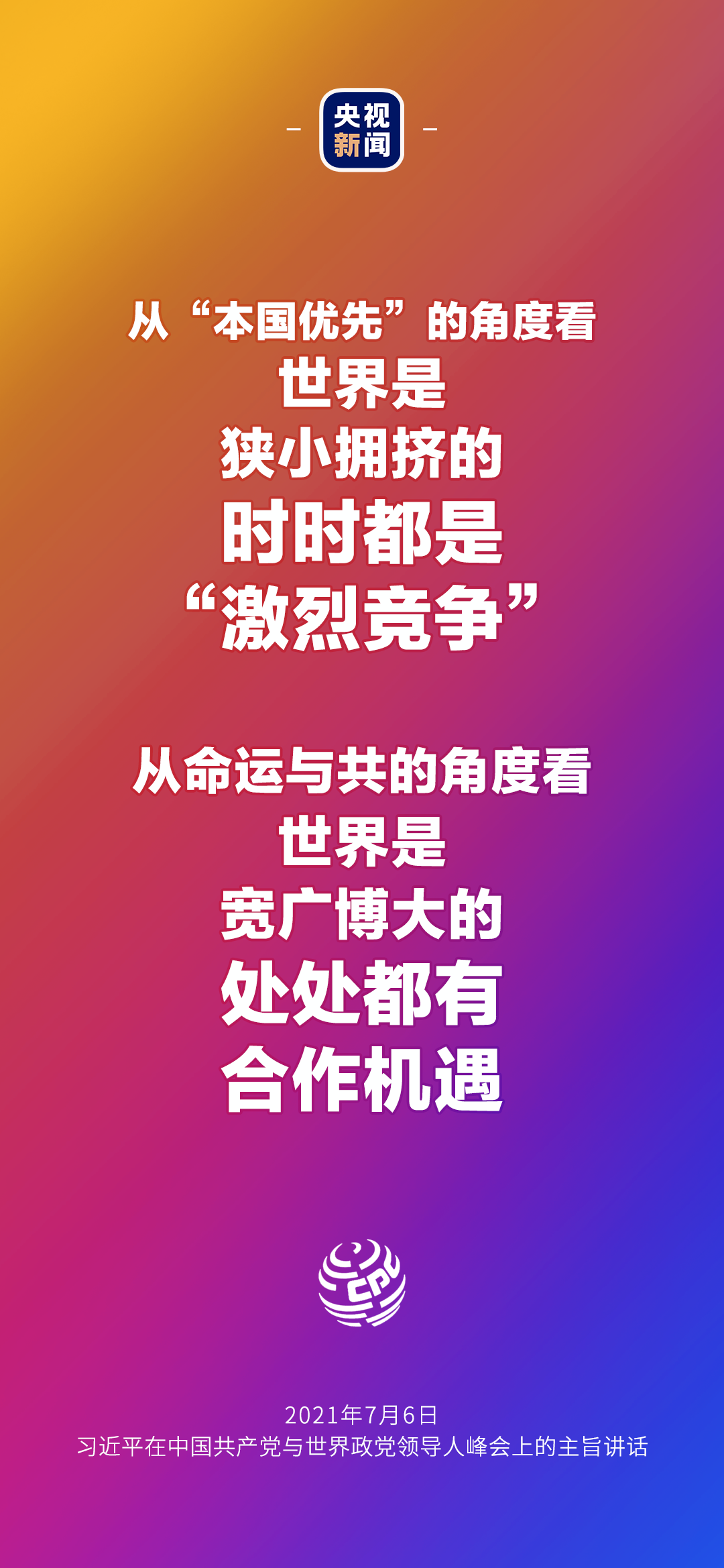 今晚,習近平總書記在出席中國共產黨與世界政黨領導人峰會時說,從“本國優先”的角度看,世界是狹小擁擠的,時時都是“激烈競爭”。從命運與共的角度看,世界是寬廣博大的,處處都有合作機遇。角度其實也是道路,有的人走前面那條路,讓別人的路難走甚至沒路走,這樣自己的路也會不好走;而我們走的是后面那條路,一定會讓大家的路越走越寬廣。