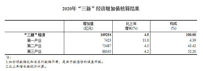2020年,盡管受到突如其來的新冠肺炎疫情的巨大沖擊和嚴峻復雜國際形勢的影響,我國新產業新業態新商業模式仍繼續保持增長。經核算,2020年我國“三新”經濟增加值為169254億元,比上年增長4.5%(未扣除價格因素,下同),比同期國內生產總值(GDP)現價增速高1.5個百分點;相當于GDP的比重為17.08%,比上年提高0.7個百分點。 分三次產業看,“三新”經濟中,第一產業增加值為7423億元,比上年增長11.0%,占比為4.39%;第二產業增加值為73487億元,比上年增長4.3%,占比為43.42%;第三產業增加值為88345億元,比上年增長4.2%,占比為52.20%。