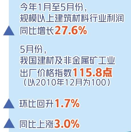 記者從中國建筑材料聯(lián)合會獲悉,今年1月至5月份,規(guī)模以上建筑材料行業(yè)利潤同比增長27.6%;5月份,我國建材及非金屬礦工業(yè)出廠價格指數(shù)115.8點(diǎn)(以2010年12月為100),環(huán)比回升1.7%,同比上漲3.0%。建材行業(yè)保持了良好發(fā)展勢頭,整體形勢穩(wěn)中有升。