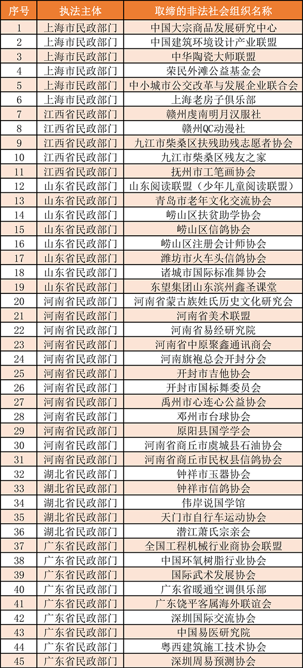 為持續加大輿論宣傳力度,提高公眾防范意識,發揮社會監督作用,現向社會公布第六批地方民政部門近年來依法取締的部分非法社會組織名單。社會公眾如果發現名單中的非法社會組織仍在開展活動的,可依法向公安機關報案。同時,提醒有關機構和社會公眾,在與社會組織開展合作或參與其活動時,請通過“中國社會組織政務服務平臺”(www.chinanpo.gov.cn)、“中國社會組織動態”政務微信(微信號:chinanpogov)核實其身份,避免上當受騙;也歡迎社會各界通過“中國社會組織政務服務平臺”提供涉嫌非法社會組織活動線索。