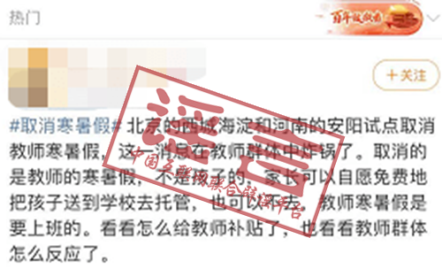 中國互聯網聯合辟謠平臺第一時間向教育部相關部門求證,確認“北京、河南試點取消教師寒暑假”為不實消息。