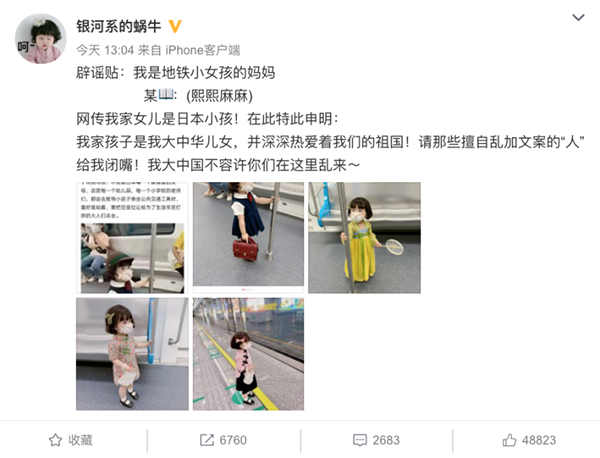 “網(wǎng)傳我家女兒是日本小孩!在此特此申明:我家孩子是我大中華兒女,并深深熱愛著我們的祖國!”7月8日,一位母親的辟謠微博引發(fā)關(guān)注。博主“銀河系的蝸牛”稱自己是“地鐵小女孩的媽媽”,之所以發(fā)出上述辟謠帖,是因為有人利用小女孩乘坐地鐵的圖片,擅自亂加文案,贊美“日本人的文明習(xí)慣”。