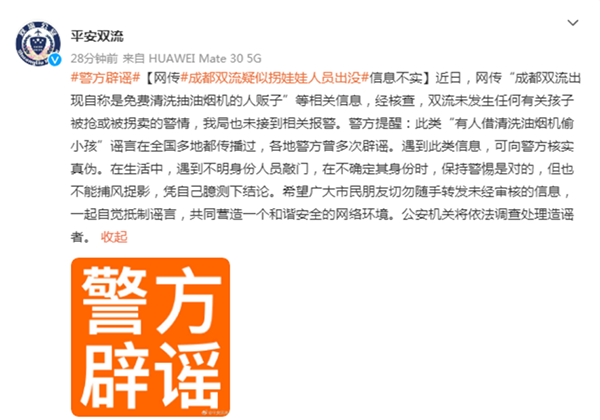 針對該傳言,成都市公安局雙流區分局于2021年7月9日在官方微博@平安雙流發布通報稱:近日,網傳“成都雙流出現自稱是免費清洗抽油煙機的人販子”等相關信息,經核查,雙流未發生任何有關孩子被搶或被拐賣的警情,我局也未接到相關報警。警方提醒:此類“有人借清洗油煙機偷小孩”謠言在全國多地都傳播過,各地警方曾多次辟謠。遇到此類信息,可向警方核實真偽。在生活中,遇到不明身份人員敲門,在不確定其身份時,保持警惕是對的,但也不能捕風捉影,憑自己臆測下結論。希望廣大市民朋友切勿隨手轉發未經審核的信息,一起自覺抵制謠言,共同營造一個和諧安全的網絡環境。公安機關將依法調查處理造謠者。