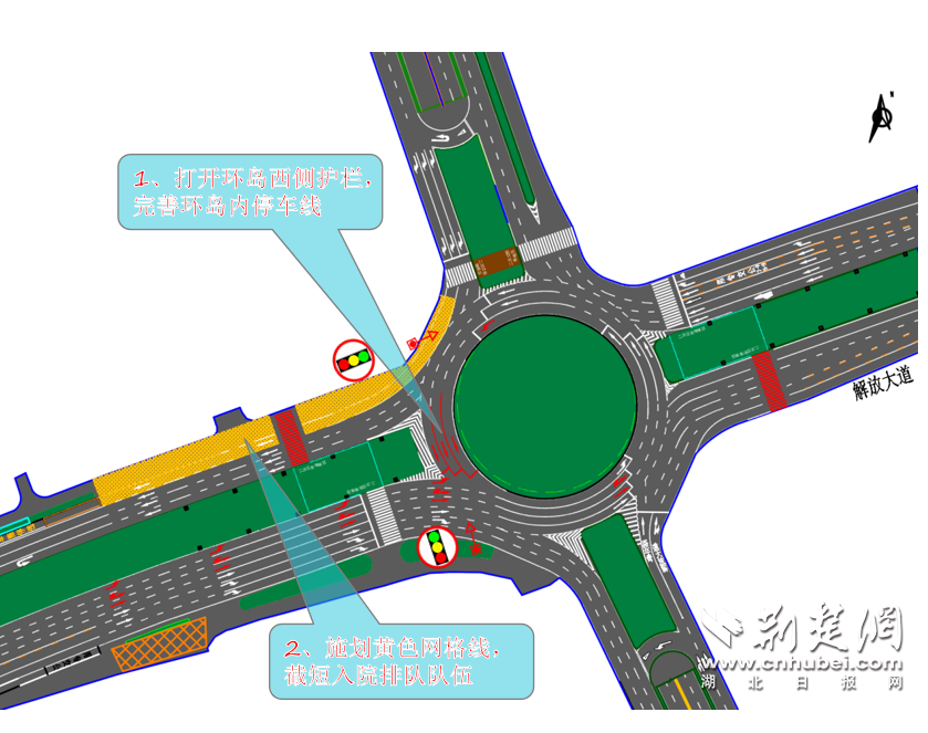 措施2:為避免同濟醫(yī)院門口車輛排隊航一層環(huán)島車輛運行的影響,施劃黃色網(wǎng)格線、將入院車輛隊尾截斷在掉頭車道處,減少對環(huán)島的影響。