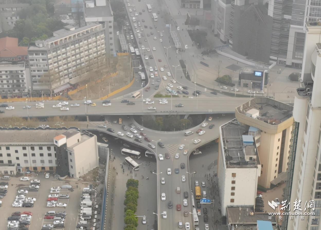 據(jù)了解,航空路立交橋為三層立交結(jié)構(gòu),地面層轉(zhuǎn)盤+信號燈控制,西側(cè)采用護欄封閉;二層高架轉(zhuǎn)盤+信號燈控制,南側(cè)采用護欄封閉;三層高架為解放大道跨青年路高架橋,東西向車輛通行。作為全市交通流量最大的區(qū)域之一,航空路立交周圍有多個商圈、公園,一條線上分布著同濟、協(xié)和兩大醫(yī)院,在地鐵還沒有建成時,解放大道的公交線路幾乎是全市最密集的路段。但由于航空路轉(zhuǎn)盤不大,大客車的轉(zhuǎn)彎半徑不夠,轉(zhuǎn)盤經(jīng)常轉(zhuǎn)不動,為了打開轉(zhuǎn)盤擁堵的“結(jié)”,根據(jù)當時實際情況,便將由北向南方向用護欄封閉,所有往江漢一橋方向的車輛全部右轉(zhuǎn),在長江大酒店對面的橋下調(diào)頭。