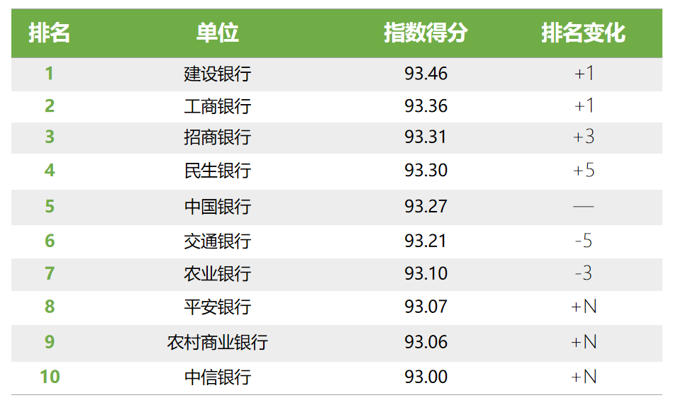 本期TOP10名單變動情況較大,建設銀行、工商銀行排名均上升一位,奪得冠亞軍;招商銀行、民生銀行排名出現小幅上升,分列第三、第四名;中國銀行排名不變,位列第五。平安銀行、農村商業銀行、中信銀行本期沖進前十。