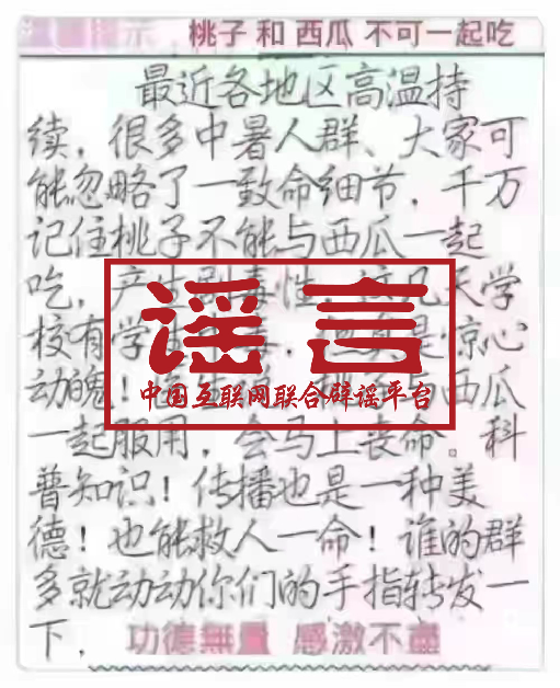 隨著夏季到來,西瓜上市,一則陳年舊謠又開始在網上流傳。謠言稱,西瓜和桃子一起吃會產生劇毒。